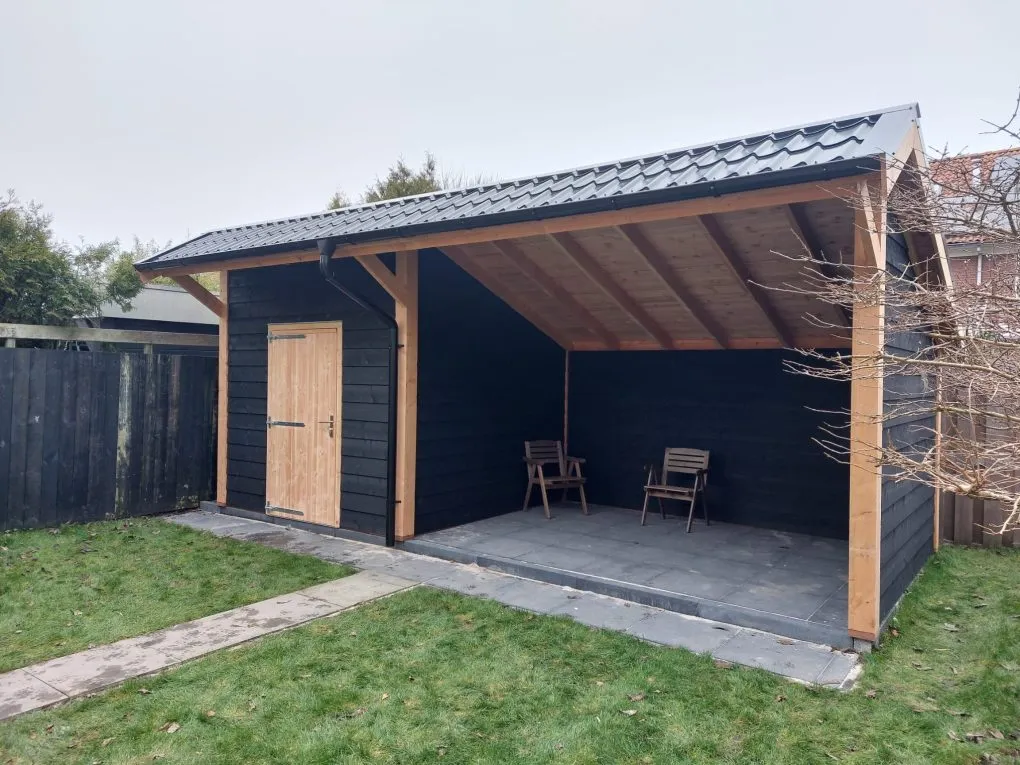 -Wanden aan de buitenzijde bekleed met zwart Zweeds rabat 24x195mm