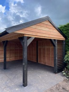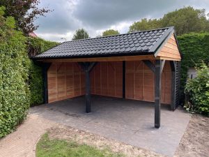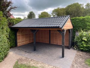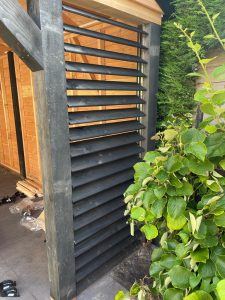 -Rechts achterin een flex fence shutter van 90cm breed en 220cm hoog met zwarte planken 16x140mm