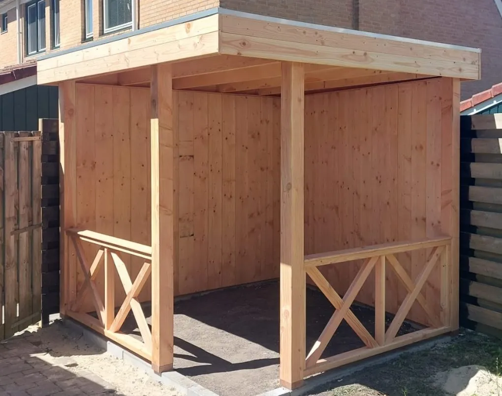 De wanden zijn aan de buitenzijde bekleed met Douglas blank Zweeds rabat en de binnenzijde is bekleed met verticale vellingdelen 18x195mm RedClass