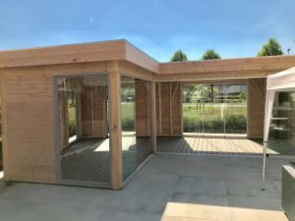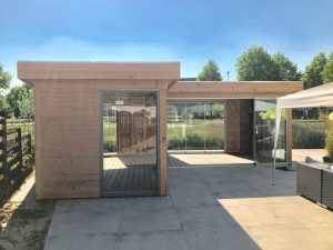 – Uitgevoerd in elementbouw, wanden zijn bekleed met blanke Douglas blokhutprofielen 28x195mm (aan 1 zijde)