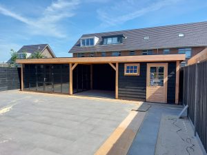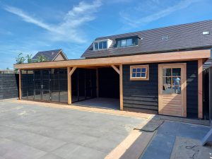 -Wanden aan de buitenzijde bekleed met zwart Zweeds rabat 24mm Incl. losse materialen t.b.v. binnenbekleding tuinkamer + berging + wand in midden open gedeelte zwart Zweeds rabat
