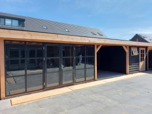 -In de voorzijde van de tuinkamer 4 steel-look kozijnen en een steel-look dubbele deur