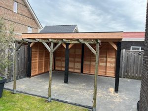 – Hardhouten funderingsrand onder de wanden en aansluitende staanders