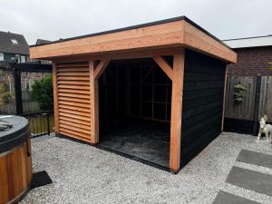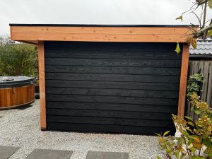 -Wanden aan de buitenzijde bekleed met Douglas zwart Zweeds rabat 27mm, zwart genageld