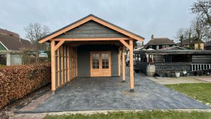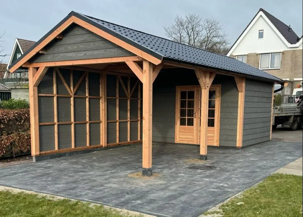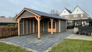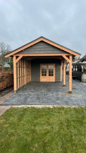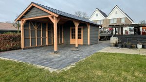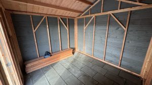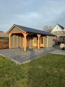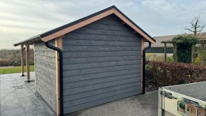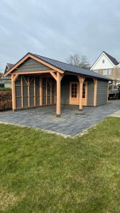 –Wij zetten de wanden hier compleet in elkaar , inclusief de deuren die hier in verwerkt zijn. Ook zit de gevelbekleding hier al tegenaan. Bij veel aanbieders krijgt u losse materialen, waarmee u dit zelf moet voorzien.