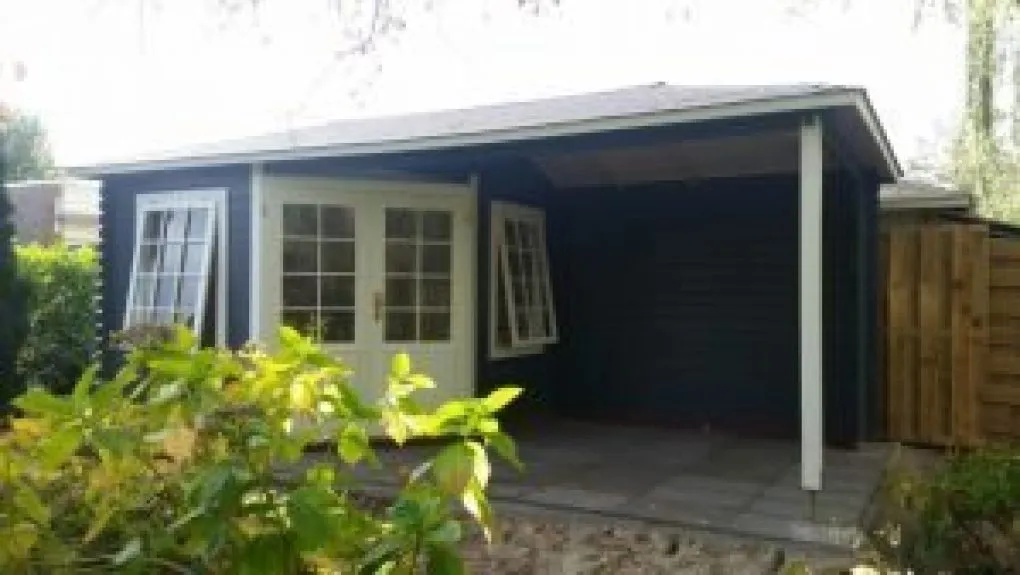 Afmeting 576x300cm, waarvan blokhut ca. 300x300cm