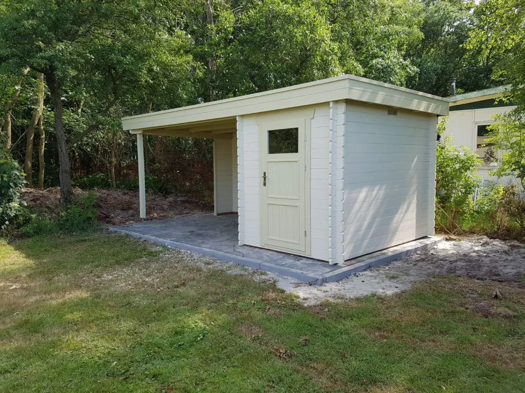 – Gecoat 2x de buitenzijde + binnenzijde veranda (binnenzijde blokhut onbehandeld) in de kleur RAL1015