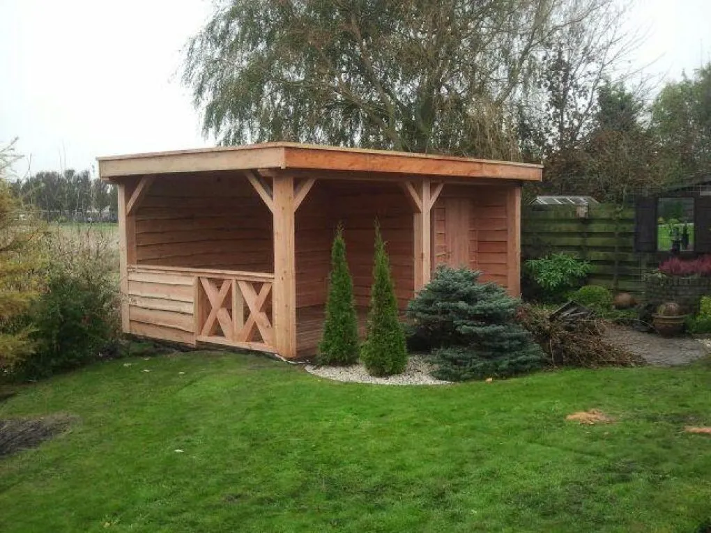 gedeelte zijwand kruishekjes van 10x10cm Lariks ,wand aan zijkant even hoog als kruishekje(als showmodel tuinprieel)