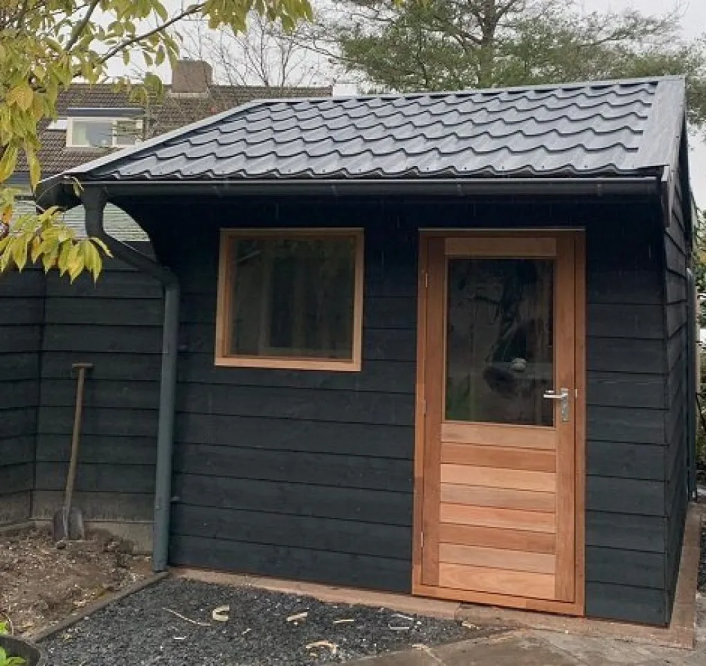 -Buitenzijde bekleed met zwart Zweeds rabat 24x195mm RVS genageld op vuren frame