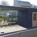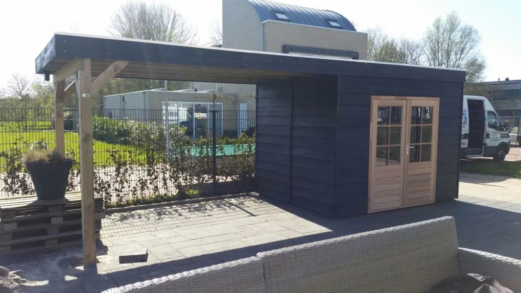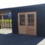 – De wanden van de schuur uitgevoerd in elementbouw, betimmerd met zwart Zweeds rabat 25x180mm, enkelzijdig bekleed