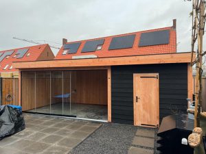 -Wij zetten de wanden hier compleet in elkaar , inclusief de deur die hier in verwerkt is. Ook zit de gevelbekleding hier al tegenaan. Bij veel aanbieders krijgt u losse materialen, waarmee u dit zelf moet voorzien.