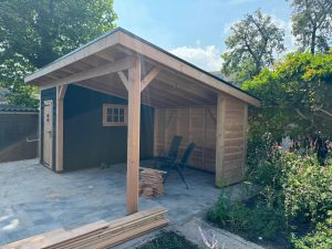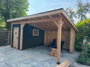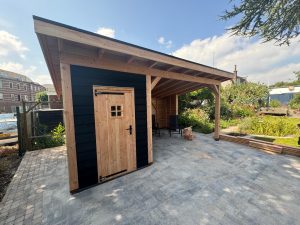 -Elementbouw, wanden bekleed met zwart Zweeds rabat aan de voorzijde en rechterzijwand van de berging