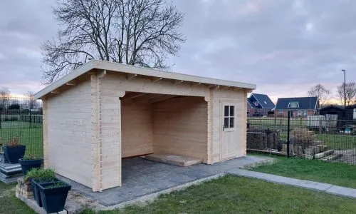 Blokhut Ideaal Complete Maatwerk -34mm vuren blokhuthout -300x300cm orenmaat -Luifel aan voorzijde 50cm -1 vuren gelamineerde dubbele deur half glas -1 vuren uitzetraam -enkel glas 4mm -Zadeldak…