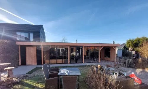 Douglas Schuur maatwerk -Ca.500cm breed (dakmaat), ca. 494x350cm (buitenkant wandmaat), Luifel ca. 40cm aan de voorzijde -Elementbouw -RedClass dakhout 18x135mm en Vuren wandregels (45x95mm) -Wanden aan de…