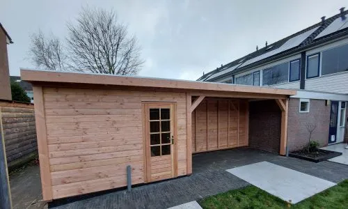 Douglas Berging Maatwerk -Ca. 500x270cm (wandmaat) -Berging rechterzijde ca. 200cm breed -Plat dak + EPDM dakbedekking incl. spraylijm, onderuitloop & kit aluminium hoek-trim -Dakoverstek voorzijde + linker…