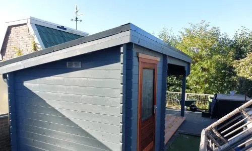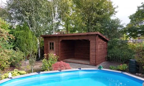Blokhut Maatwerk -ca.796x496cm (orenmaat) -Berging ca.400cm (binnenmaat) x 496cm (orenmaat) , berging ca.266cmx100cm (binnenmaat), rest overkapping en links een overstek van ca.92cm -44mm bruin geïmpregneerd vuren blokhuthout…