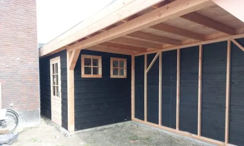 Douglas vrijstaande overkapping -600×300 ( buitenmaat staanders ) – RedClass dakhout 18x135mm en RedClass wandregels (Douglas-look) -Wanden aan de buitenzijde bekleed met Douglas zwart Zweeds rabat 27mm…