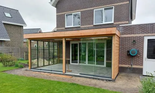 Douglas maatwerk aanbouw overkapping Afmeting 660x400cm Op het platte dak EPDM dakbedekking, bovenop het boeideel strak afgewerkt met een zwarte hoektrim In de linkerzijde 5 vaste steellook…