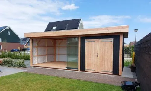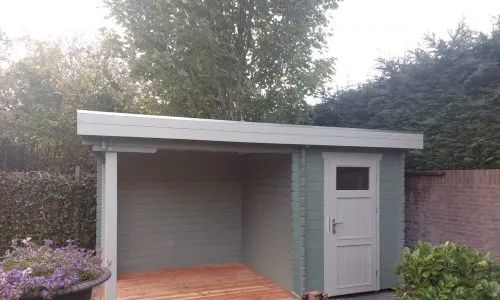 Daalders Choice plat dak model maatwerk -34mm vuren gecoat blokhuthout wanden in ral 7033, accenten in ral 7032 -±450x250cm orenmaat, waarvan berging ±170cm binnenmaat -Achterwand + klein…