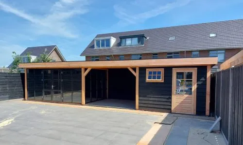 Douglas tuinkamer, overkapping en berging maatwerk –Totale dakmaat ±1240x360cm -Tuinkamer ca.509x331cm -Berging ca.350x331cm -Wanden aan de buitenzijde bekleed met zwart Zweeds rabat 24mm Incl. losse materialen t.b.v.…