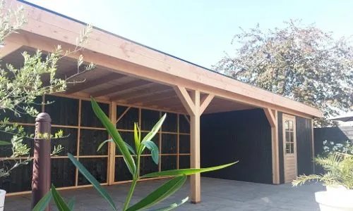 Vrijstaande overkapping “Robijn Maatwerk” -±728x405cm staandermaat -Achterwand enkelzijdig bekleed met zwart vuren Zweeds rabat 24mm, zwart genageld -Beide zijdes enkelzijdig ±95cm gesloten met zwart vuren Zweeds rabat…