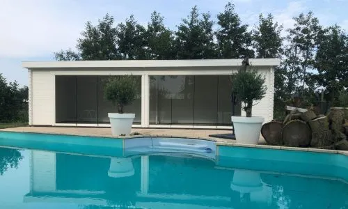 “Blokhut veranda“ maatwerk – Afmeting ca. 1000x330cm orenmaat – Uitgevoerd in 60mm vuren blokhuthout – Gecoat 2x buitenzijde + binnenzijde wanden RAL 9010 – Achterwand, beide zijwanden…