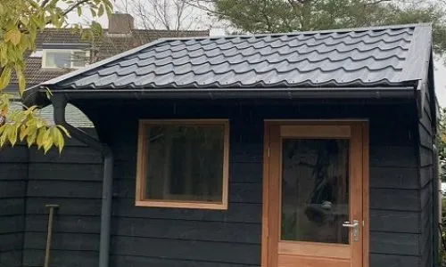 ‘’Luxe tuinhuis’’ -Ca. 300x300cm -Luifel aan de voorzijde ca. 70cm -Elementbouw -Buitenzijde bekleed met zwart Zweeds rabat 24x195mm RVS genageld op vuren frame -Wandhoogte ca. 225cm -Nokhoogte…