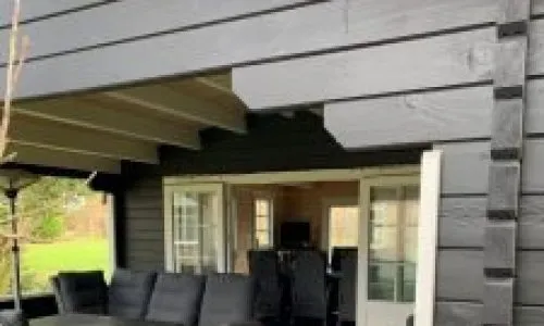 “ All-In Blokhut “ Afmeting 500 x 500cm binnenmaat + veranda 400cm – Aangegeven maten zijn binnenmaten -60mm vuren blokhuthout gecoat 2x aan de buitenzijde + binnenzijde…