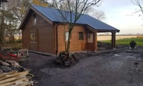 Maatwerk ‘’Chalet’’ – Afmeting 820x947cm orenmaat – Indelingen voor woonkamer/keuken, werkruimte, badkamer en schuurruimte, zie schets – Uitgevoerd in 90mm onbehandeld vuren blokhuthout – ISO-kwaliteit deuren en…