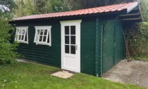 Blokhut Garage Maatwerk – Afmeting 370x600cm orenmaat + voorluifel ± 90cm – Uitgevoerd in 60mm vuren blokhuthout – Buitenzijdes, dubbele deur en waterborden 2x gecoat in RAL…