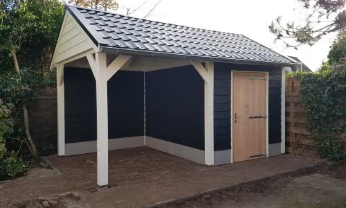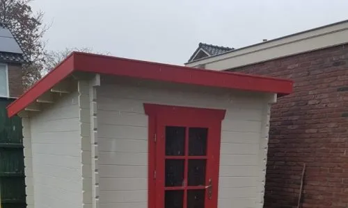Orenmaat ± 250 x 250 cm 34mm Vuren blokhuthout, 2x gecoat aan de buitenzijde 1x Vuren enkele deur half glas Hoogte voorzijde ± 230 cm Hoogte achterzijde…