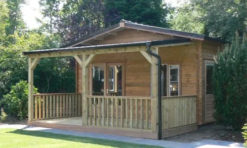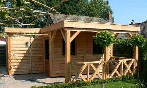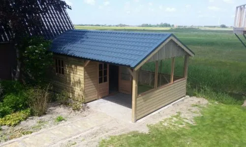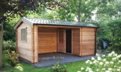 Uitgevoerd in 28mm protex behandeld blokhuthout Afmeting 500x270cm binnenmaat, waarvan blokhut 150x270cm Hardhouten funderingsrand onder wanden Hardhouten enkele deur half glas Hardhouten vast raam Enkel glas Hardhouten…