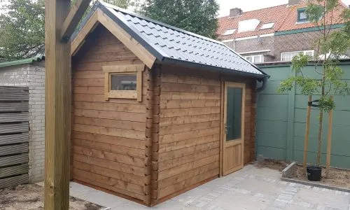 “ Blokhut Zadeldak “ ( maatwerk ) -380x220cm ( orenmaat ) -45 mm bruin geïmpregneerd blokhuthout -Dakoverstek zelfde als bij model “ Vlieland “ -1 vuren…