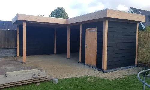 – Afmeting schuur 400x450cm – Afmeting overkapping 300x450cm – Uitgevoerd in elementbouw, betimmerd met 19mm geïmpregneerd rabat op een hardhouten funderingsrand – Hardhouten dubbele deur half glas…
