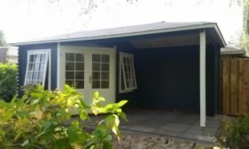 Uitgevoerd in elementbouw, betimmerd met Zweeds geïmpregneerd rabat 30x185mm (alleen binnenzijde achterwand luifel is betimmerd met 21x145mm Zweeds rabat) Afmeting 495x350cm, waarvan schuur 145cm breed Plat dak…