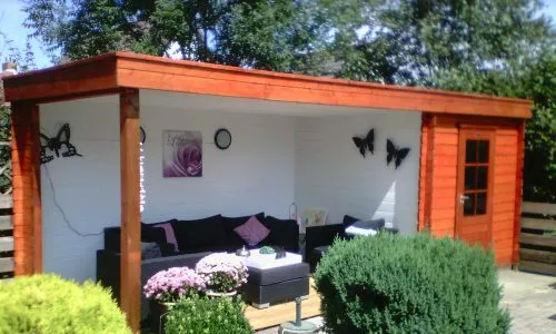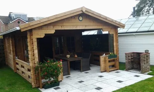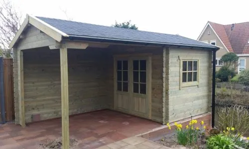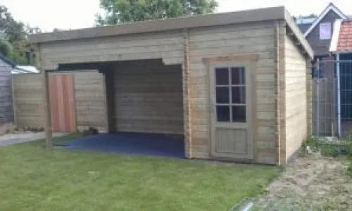 – Uitgevoerd in 34mm groen keteldruk geïmpregneerd blokhuthout – Afmeting totaal 298x545cm orenmaat – Waarvan de blokhut 298x250cm orenmaat, rest luifel – Linkerzijwand luifel + klein stukje…