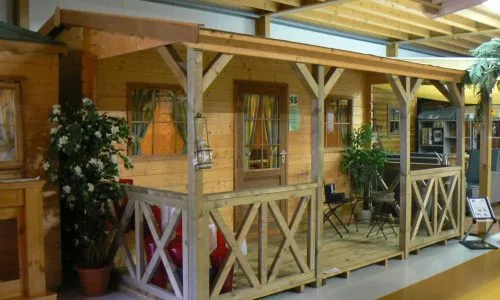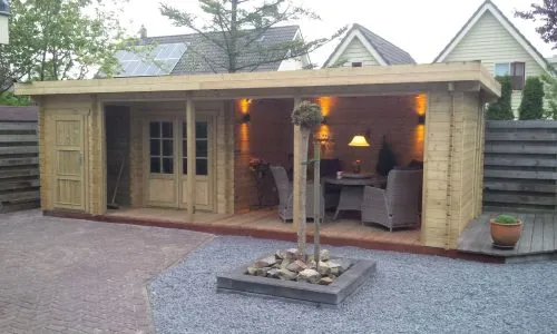Uitgevoerd in 28mm onbehandeld vuren blokhuthout Afmeting 650x250cm orenmaat, waarvan blokhut 250x250cm Hardhouten funderingsrand onder wanden Geïmpregneerd terrasvlonder 28x145mm op hardhouten liggers + RVS schroeven in veranda…