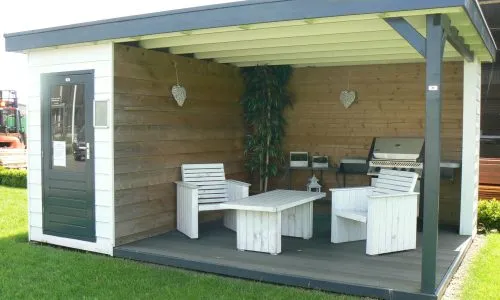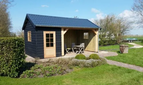 – Afmeting totaal 600x350cm buitenmaat wand – Waarvan berging ca. 200x350cm, veranda ca. 400x350cm – Achterwand + rechterzijwand veranda gesloten – Uitgevoerd in elementbouw, betimmerd met zwart…
