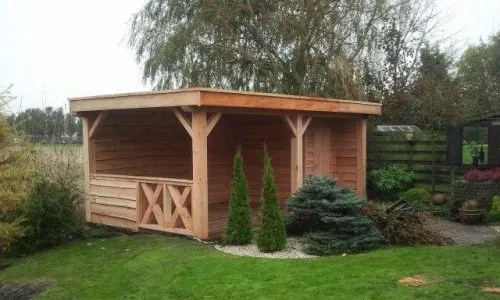 600x340cm wanden in elementbouw,betimmerd met Lariks schaaldelen Lariks hoek/tussenpalen 17x17cm berging ca. 140x250cm buitenmaat dichte enkele deur in berging gedeelte zijwand kruishekjes van 10x10cm Lariks ,wand aan…