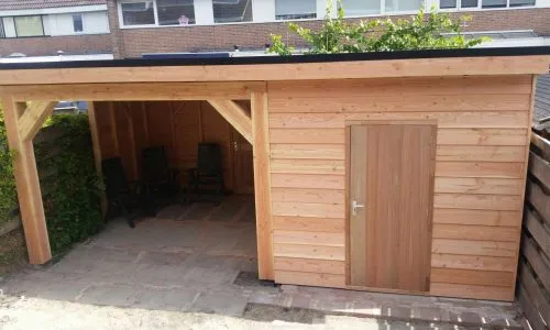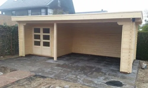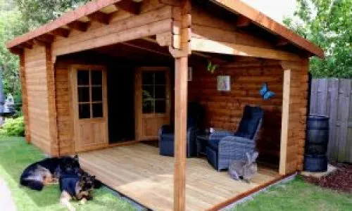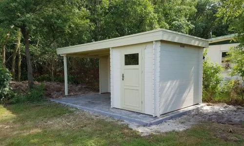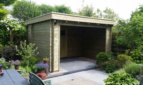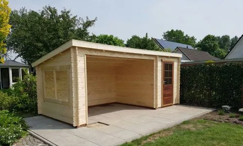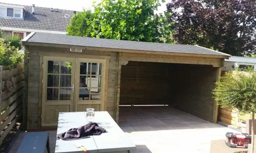 – Afmeting 580x275cm orenmaat, waarvan berging 200cm breed – Uitgevoerd in 28mm onbehandeld vuren blokhuthout – Hardhouten enkele deur half glas – Achterwand + zijwand + kort…