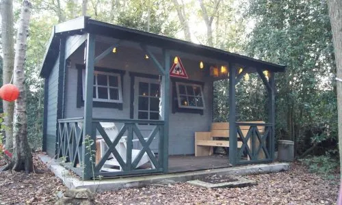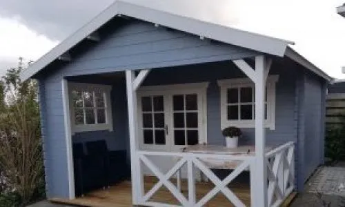 – Afmeting totaal 400x500cm orenmaat, waarvan veranda 400x200cm – Uitgevoerd in 34mm vuren blokhuthout – De wanden zijn 2x gecoat in de kleur RAL7046 (grijs), de deuren,…