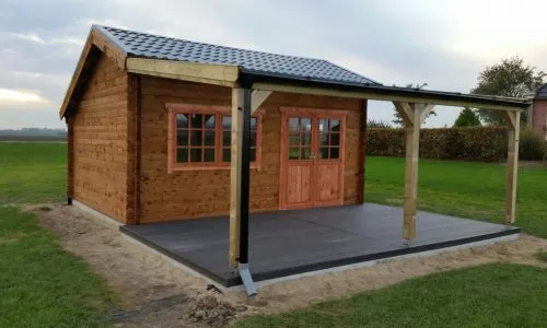 – Afmeting 420x400cm orenmaat (voor de helft veranda, voor de helft blokhut) – Uitgevoerd in 28mm groen geïmpregneerd blokhuthout (door klant geverfd in kleur) – 1x vuren…