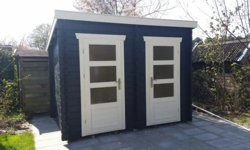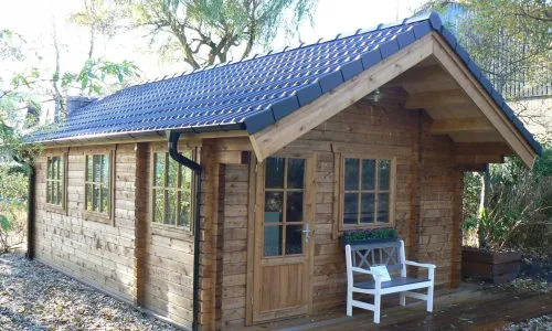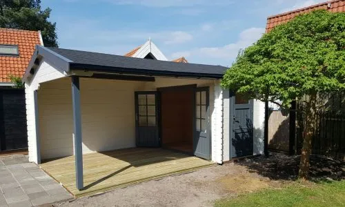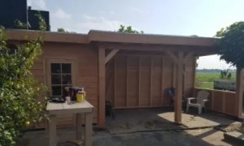 – Afmeting 500x300cm orenmaat, waarvan blokhut 250x300cm – Uitgevoerd in 34mm bruin keteldruk geïmpregneerd blokhuthout – Vuren dubbele deur met klein bovenraampje – Enkel glas – Op…