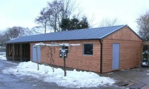 – Afmeting totaal 1200x500cm, waarvan schuur 800x500cm – Uitgevoerd in elementbouw, wanden zijn bekleed met zwart Douglas Zweeds rabat 27x195mm, RVS genageld op een solide frame –…