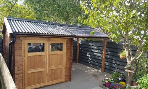 – Afmeting berging ca. 200x200cm – Afmeting zijluifel rechts 500x250cm – Zijluifeltje links tegen berging ca. 60cm – Wanden van de berging, achterwand en zijwand (ca. 90cm…