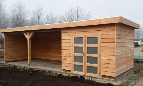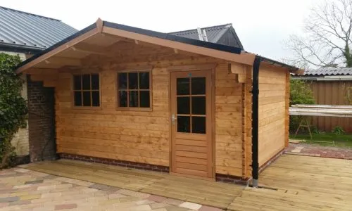– Afmeting 450x300cm binnenmaat + luifel 90cm – Uitgevoerd in 45mm protex behandeld blokhuthout – Hardhouten enkele deur half glas – 2x hardhouten vast raam – Enkel…