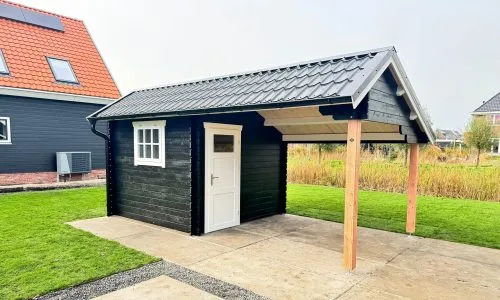 Blokhut “Daalders Choice” Maatwerk -600x300cm orenmaat, waarvan berging 300x300cm -34mm Vuren blokhuthout -Gecoat in RAL9005, accenten in RAL9010 -Enkele deur met hoog raampje -6-ruits uitzetraam -Enkel glas…