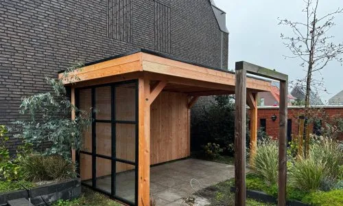 Aanbouw Douglas overkapping -590x200cm -3 Douglas duplo verlijmd staanders 118x118mm -Beide zijwanden gesloten met Douglas blank Zweeds rabat -Plat dak incl. EPDM dakbedekking -Dakoverstek aan de voorzijde…