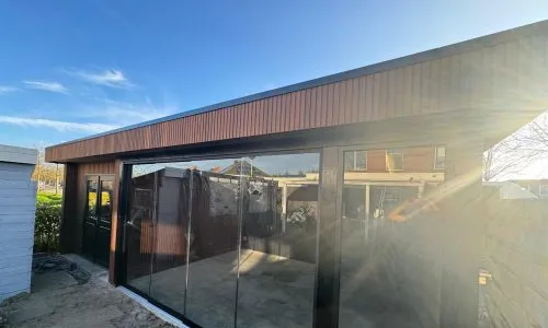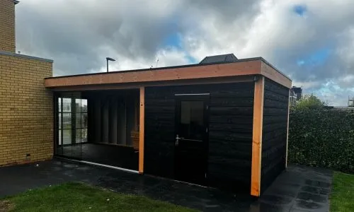 Maatwerk model “Jade” -815x370cm staandermaat, waarvan berging 320x370cm -Voorzijde en rechterzijwand van de berging bekleed met Ayous triple rhombus profiel -Achterwand en rechterzijwand + linkerzijwand berging met…