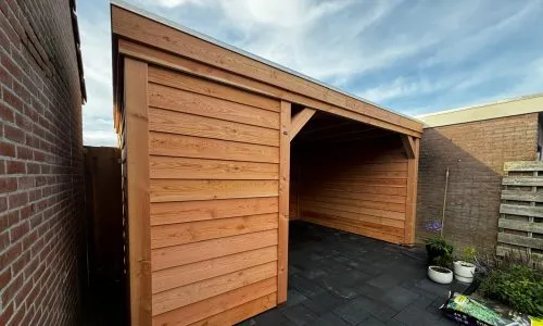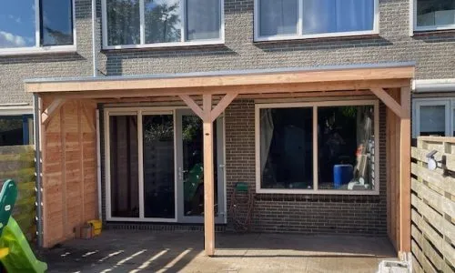 Aanbouw overkapping en berging -500x350cm, waarvan berging 150x350cm -Wanden aan de buitenzijde bekleed met Douglas blank Zweeds rabat -6 Douglas staanders 140x140mm, 2 schoren 130x130mm -1 Douglas…